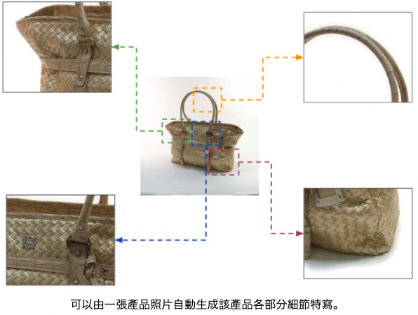 圖像局部特寫功能,是從一張產品照片中剪切出細節部分並自動生成產品描述所需的多個局部特寫的功能。