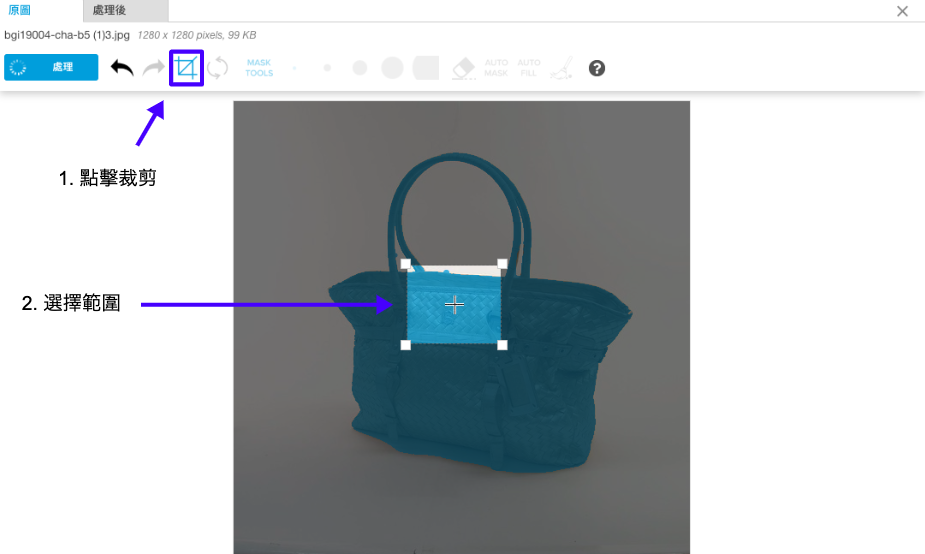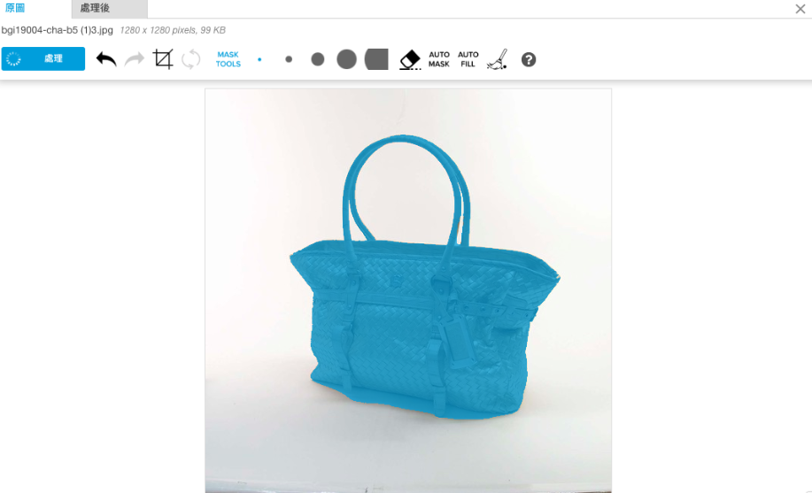2. 激活蒙版工具時,圖像主體(商品)會自動塗成藍色。請手動填充任何沒有被填充的部分。